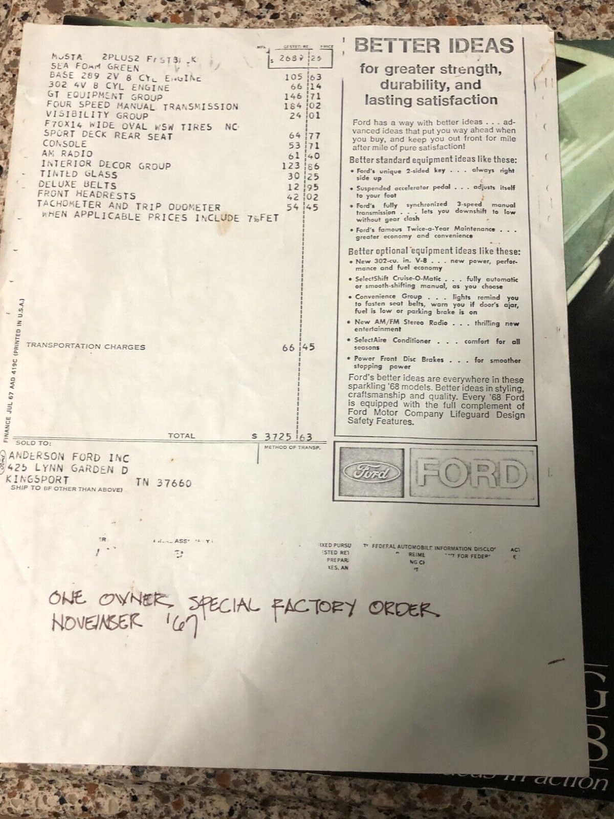 Fourni également le jour de la vente, de nombreux documents originaux qui rassureront le nouveau propriétaire sur l’historique du véhicule : carte de garantie de 1968, bon de commande original, manuel du propriétaire, et titre original (l’équivalent de notre certificat d’immatriculation). Un véritable témoignage d’histoire.