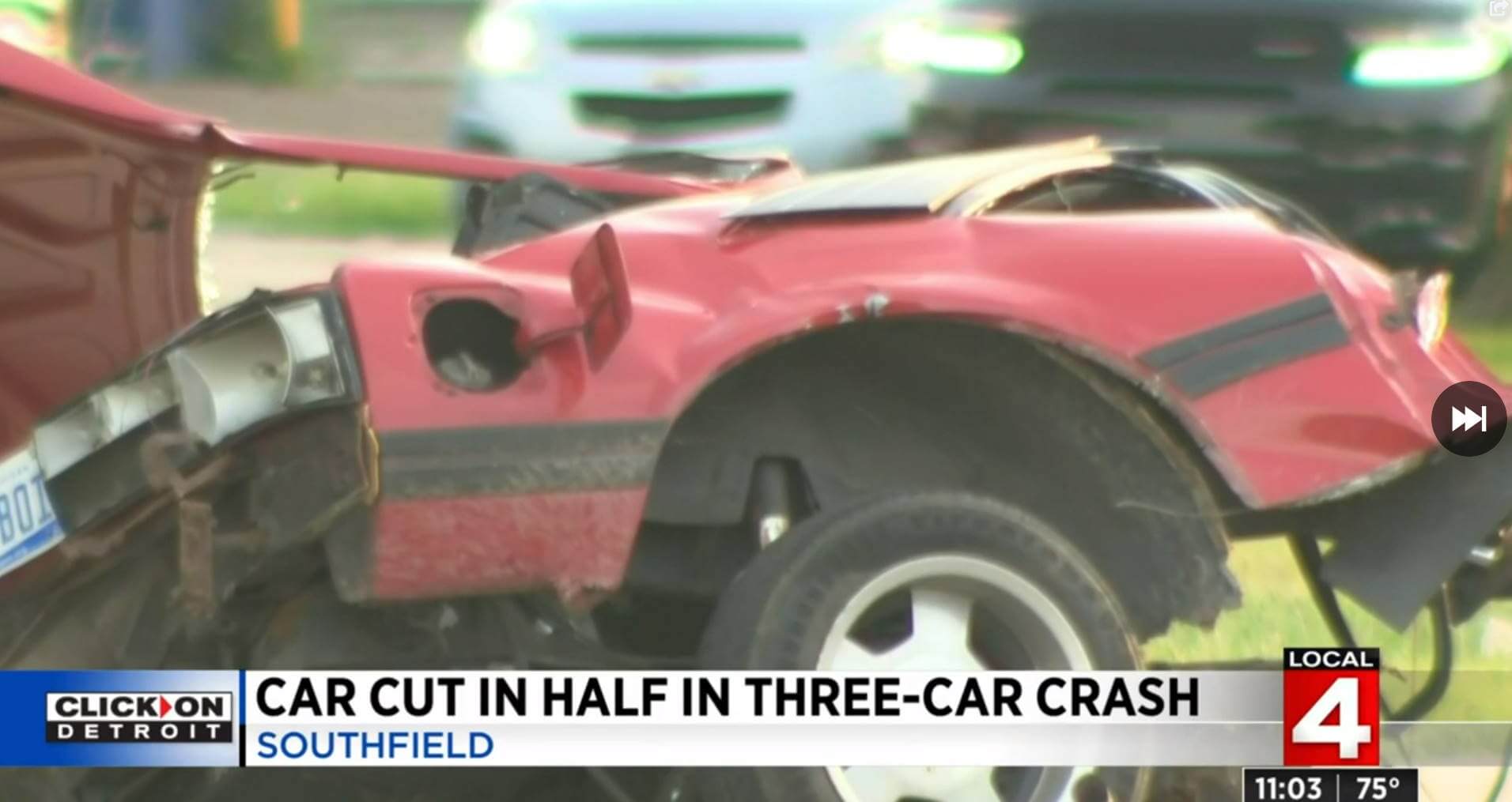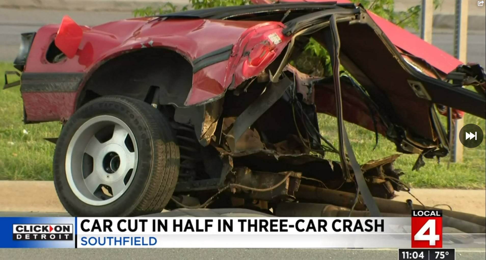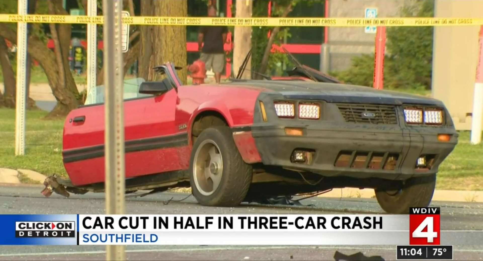 Comme en témoignent les photos publiées sur le média local ClickOnDetroit, la Mustang a littéralement été coupée en deux sous la violence du choc et le SUV a terminé sa course dans un mur de séparation entre une laverie et un fast-food de la chaîne Wendy’s.