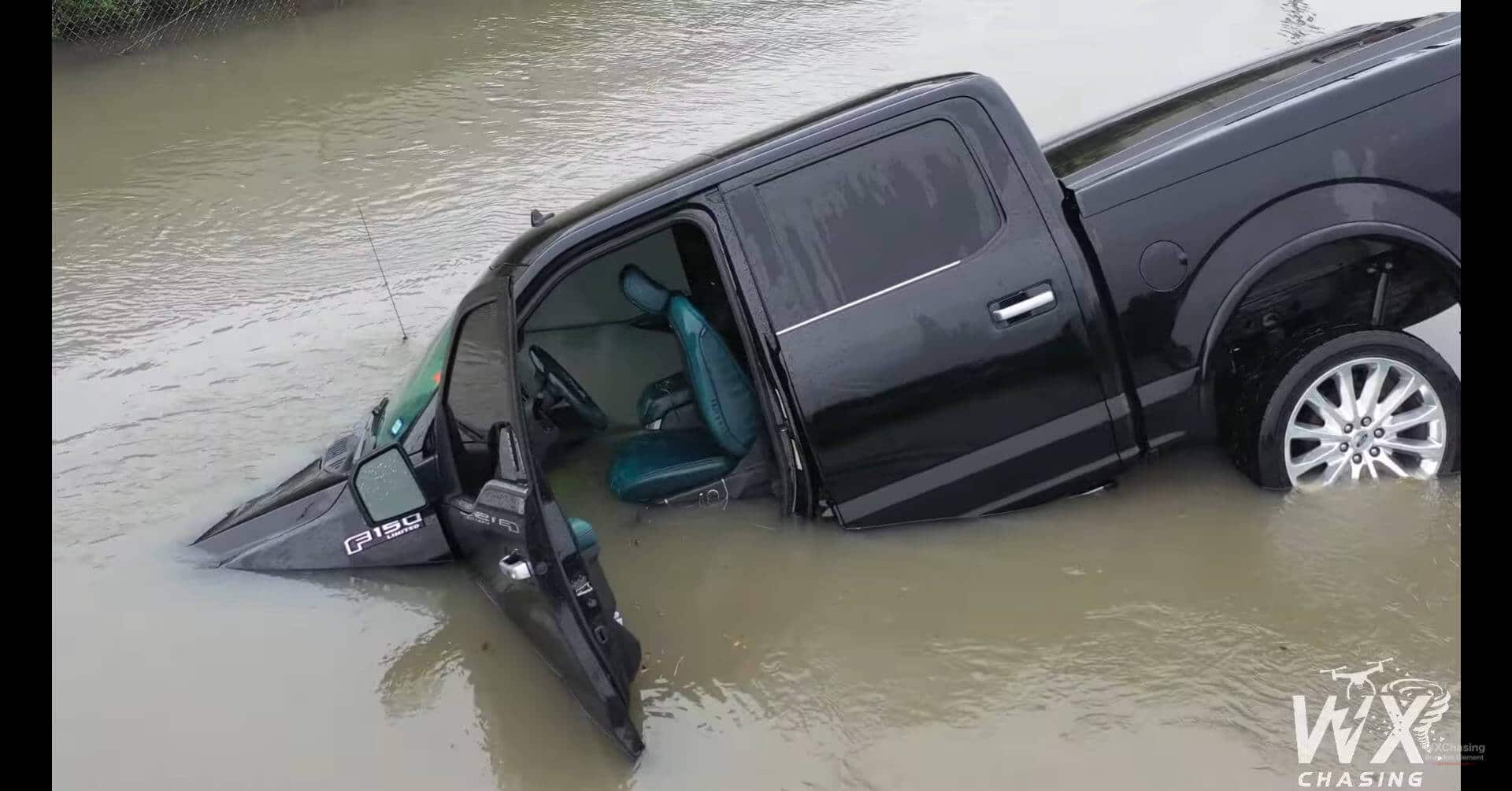 La scène est digne d’un film apocalyptique : Ford F-150, Jeep et autres SUV abandonnées par leur propriétaire, Dodge Challenger totalement immergé dans une eau boueuse et Ford Mustang prise au piège par la rapide montée des eaux. Les dégâts sont impressionnants.