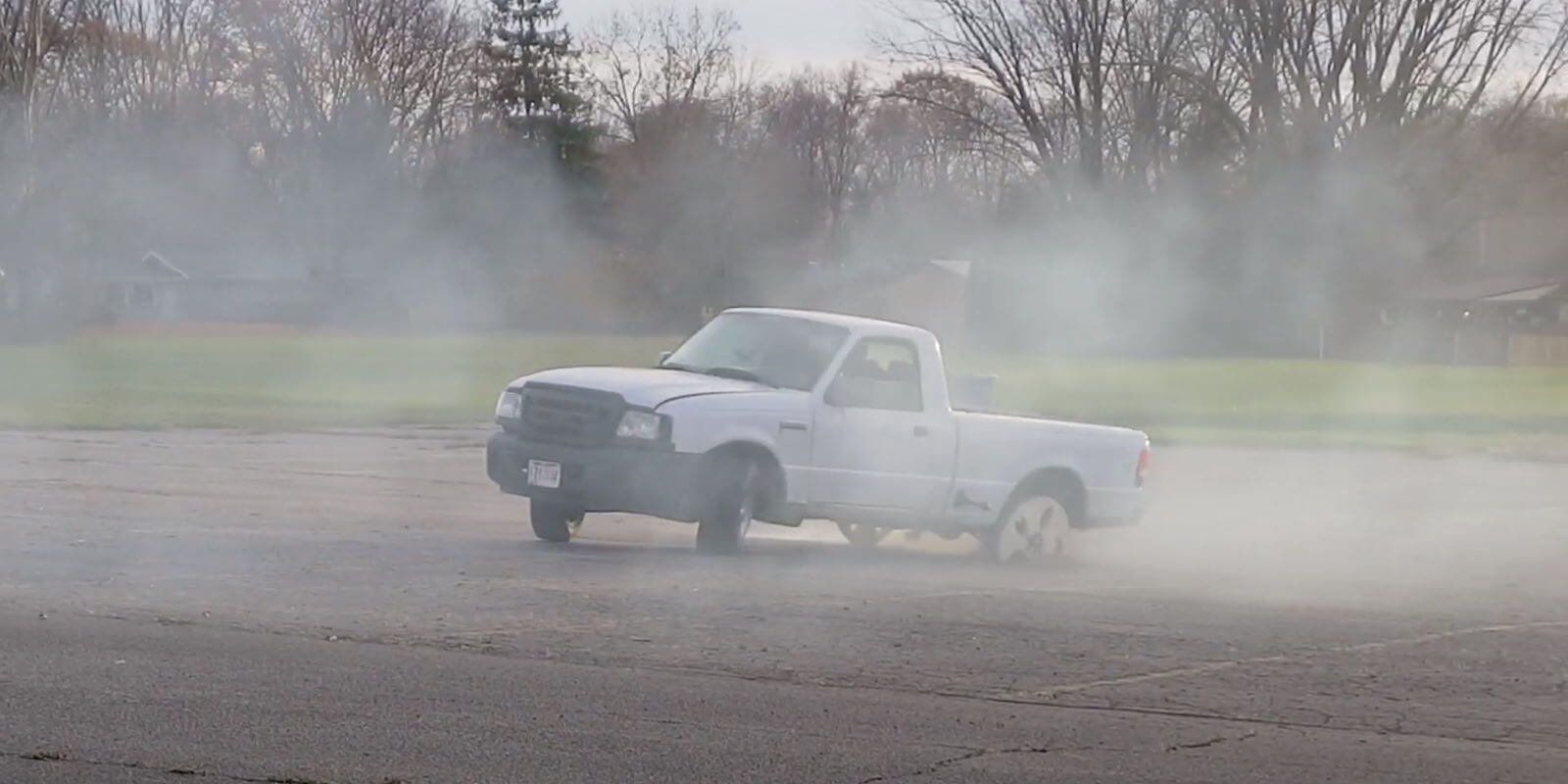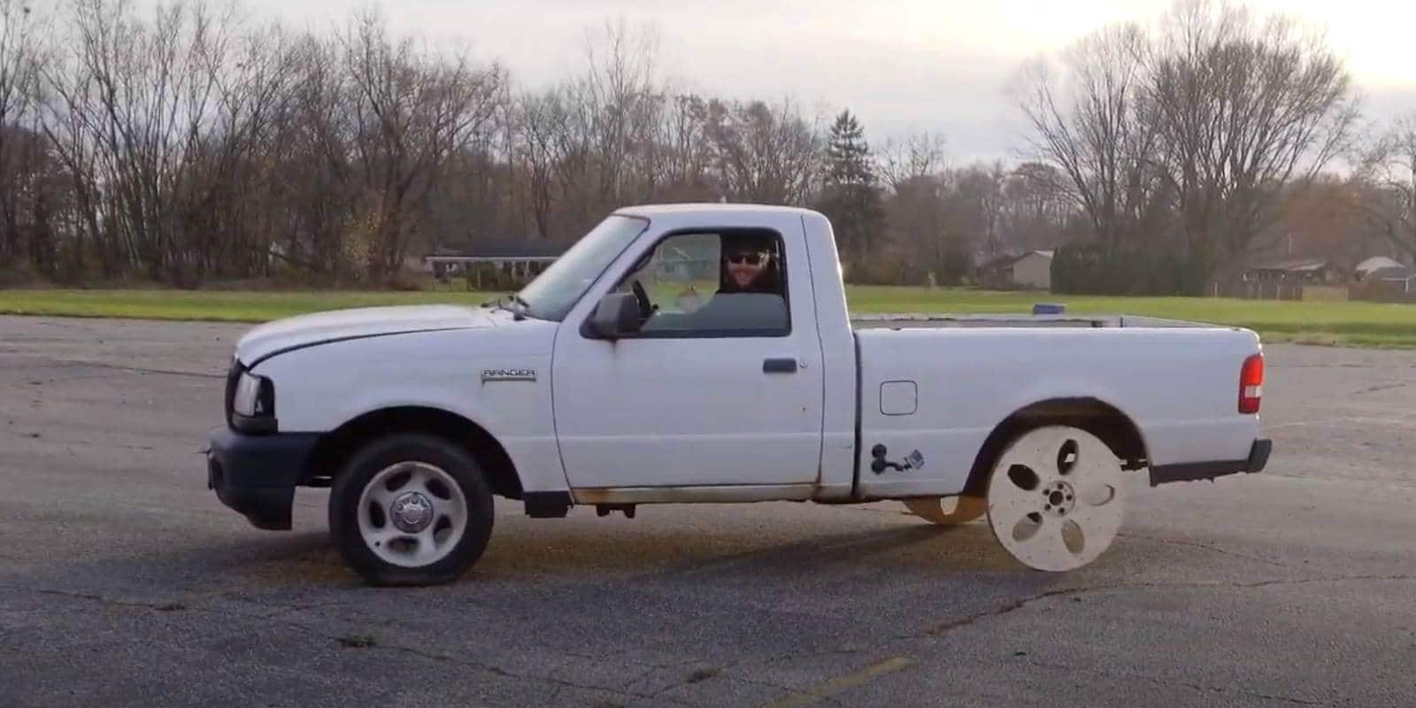 Nostalgique d’une époque qu’il n’a pas connu, ou simple délire de YouTubeur en mal visibilité, le propriétaire de ce Ford Ranger “Regular Cab” (traduisez : simple cabine) a équipé l’essieu arrière de son pick-up avec des roues de 27 pouces fabriquées en bois.