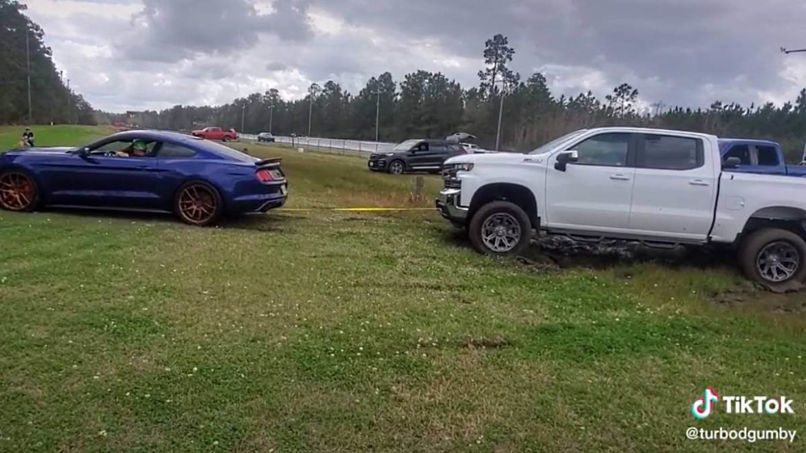 @turbodgumby My wife’s Mustang pulling out a Brand new Chevy z71 4×4 on new 35″ nitrous tires